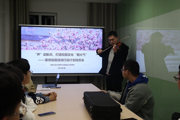 活动中,左能紧扣部分同学审美素养较为薄弱的情况,就学院美育活动方案和“声”动斛兵工作室的运营思路进行了介绍,并组织同学们欣赏了工作室的原创歌曲《拾年·光华》《同一片蓝天》和原创MV《不忘初心(合工大学子献礼二十大)》。艺术歌曲《拾年·光华》描绘了党的十八大以来家乡的发展变化,表达了当代青年正值芳华、肩负使命,加速奔跑在民族复兴赛道上的爱国情怀和一腔热血;说唱歌曲《同一片蓝天》以温馨欢快的旋律和富时代感的节奏号召全体工大学子共克时艰、抗击疫情;原创MV《不忘初心(合工大学子献礼二十大)》展现了电气学子奋发昂扬的精神风貌,抒发了对一代代共产党人不忘初心、坚定信念、奋勇拼搏的崇敬之情。作品动听的旋律和优美的意境感染了在场的每一位同学。