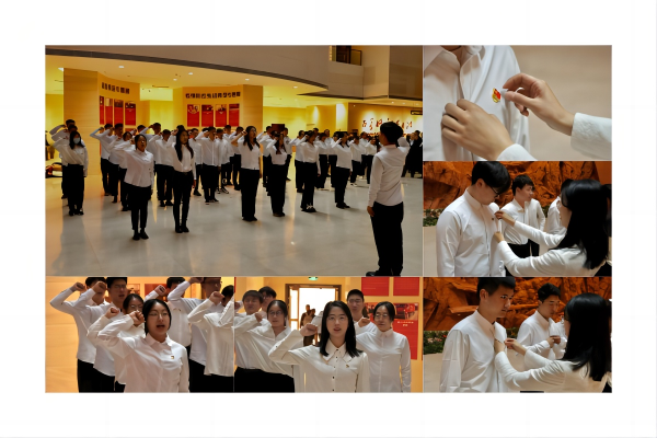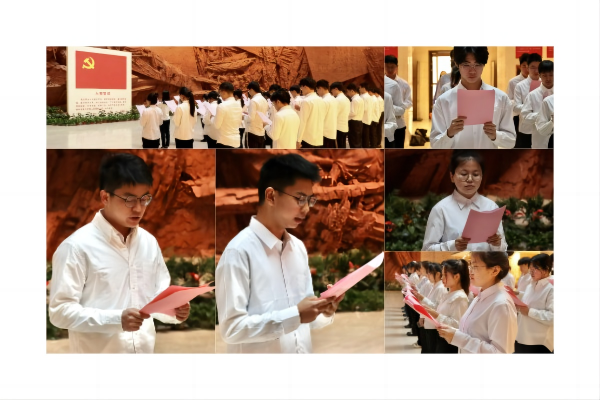 活动中,各学生党支部书记为新发展学生党员佩戴党员徽章,这种薪火相传的佩戴仪式,是鞭策,是激励,是精神的传承,是奋斗的延续。在本科生第五党支部书记秦天的带领下,面对鲜艳的中国共产党党旗,全体党员庄严宣誓:“我志愿加入中国共产党……随时准备为党和人民牺牲一切,永不叛党。”铮铮誓言,掷地有声,拳拳热血,不忘初心。