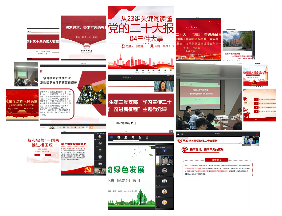 提升有亮点,微党课上有热度。为固化学习成果,让理论学习入脑入心入行,各支部分别围绕极不平凡的五年、增进民生福祉、推动绿色发展、中国式现代化、实施科教兴国战略等二十大报告中的关键词,开展了“党的二十大之我见”主题微党课。主讲人紧密结合自己的学习、工作、生活进行讲解,给人以教育和启迪。“微党课”学习也检验了前期个人自学、专题党课和交流学习讨论的成效,进一步加深了全体党员对党的二十大报告的理解和掌握,增强了学生党员学思践悟的思想自觉、理论自觉和行动自觉。