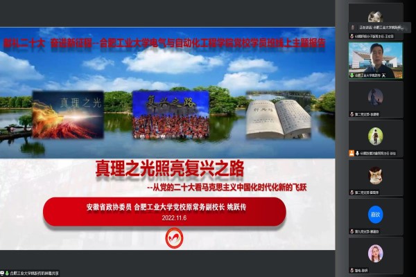 11月6日下午,3003新葡的京集团网址开展专题党课学习。安徽省政协委员、学校党校原常务副校长姚跃传以“真理之光照亮复兴之路——从党的二十大看实现马克思主义中国化时代化新的飞跃”为题,通过线上的方式讲授党课,学院党校班主任以及发展对象班和积极分子班全体学员参与学习。