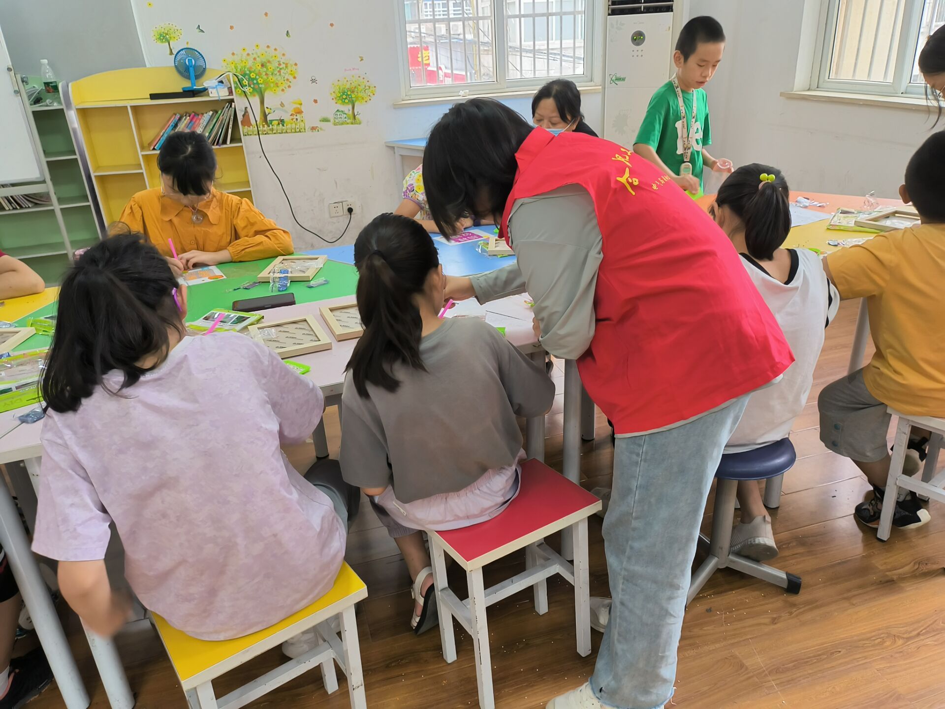 绘制手工贴画,提升动手能力。志愿者前往龚湾社区开展“钻石画”手工活动,在志愿者指导下,小朋友按照对应的数字将小小的“钻石”粘取到画布上。这个过程不仅需要动手能力,还需要耐心和细致的注意力,因为每一颗“钻石”的位置都需要仔细对应,以确保最终的钻石画圆满完成。在志愿者的热心地指导和鼓励下,小朋友们充满信心,不断克服困难。最终,每一位孩子都成功完成了美丽的钻石画,并将其装入精致的相框中,这个作品既是他们努力的结晶,也是一份珍贵的礼物。