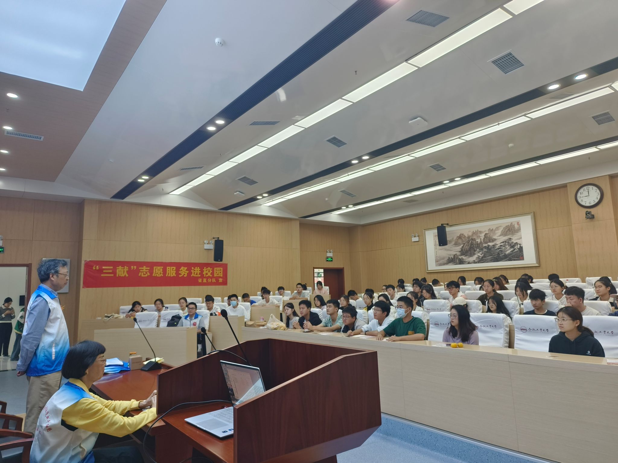 活动伊始,姜从山、文世乐和黄国荣依次分享了自己的献血和志愿服务经历。“不同的原因,一样的理想,拯救很多的人!”由于人类目前还无法实现人造血,需要输血进行救治的病人还有很多,血量需求仍然很大,献血的意义不言而喻。姜从山在分享中传递心有大爱、无私奉献、为人服务的志愿精神。志愿者们听到前辈们的志愿服经历,内心深处充满感动,激发了青年学子的奉献热情,积极投身“三献”志愿服务。随后,文世乐向志愿者科普科学献血的知识,包括血型、血液的构成、血液的生成、血液的新陈代谢、造血的原料等。同时,他用一个个鲜活的案例向同学们讲述身边的英雄故事,合肥市百次献血者王军麾、於云,中国新生代献血第一人金昕,一个个事迹感人至深,现场志愿者深切感受到献血者的奉献与伟大。为保障有献血意愿志愿者的身体健康,文世乐还向志愿者们讲述了献血的条件与献血各项注意事项,如献血前24小时不能喝酒熬夜,近一年内没有进行外科手术,献血需携带身份证等有效身份证件,献完血后需等待10分钟左右,无晕眩等反应才可离开,并提醒志愿者们献血后不要揉搓针眼、不要剧烈运动,为想要献血的志愿者们做好安全提示。提问环节,文世乐、姜从山、黄国荣对志愿者的相关问题进行详细解答,一问一答中,志愿者们对献血的条件、注意事项、合肥市献血政策有了更加深刻的认识,更加激发了积极参与志愿服务的热情和决心。