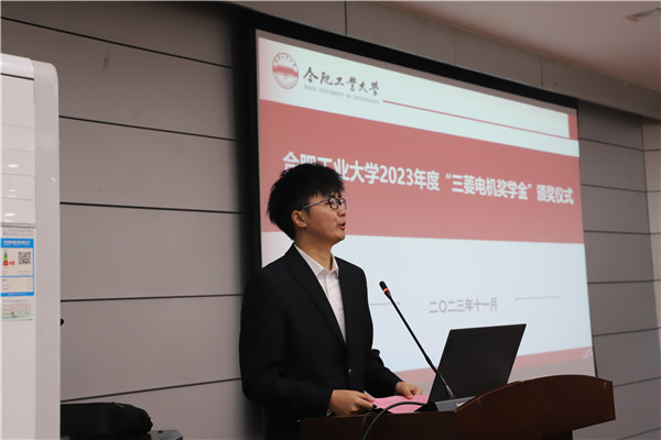 三菱电机捷敏功率半导体(合肥)有限公司技术服务总监商明在致辞中向与会师生介绍了“三菱电机”设置的由来,向获得奖助学金的同学表示祝贺,并勉励在场同学,人才是推动社会和企业向前发展的力量所在,希望同学们可以不忘初心,不骛虚声,敢于创新,大胆实践,三菱电机衷心地希望和相信大家在未来的职业生涯中为社会做出更大的贡献。