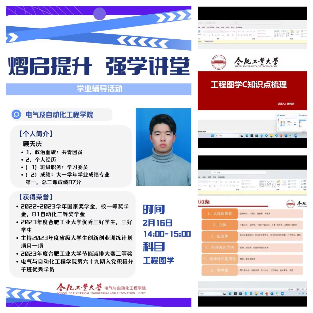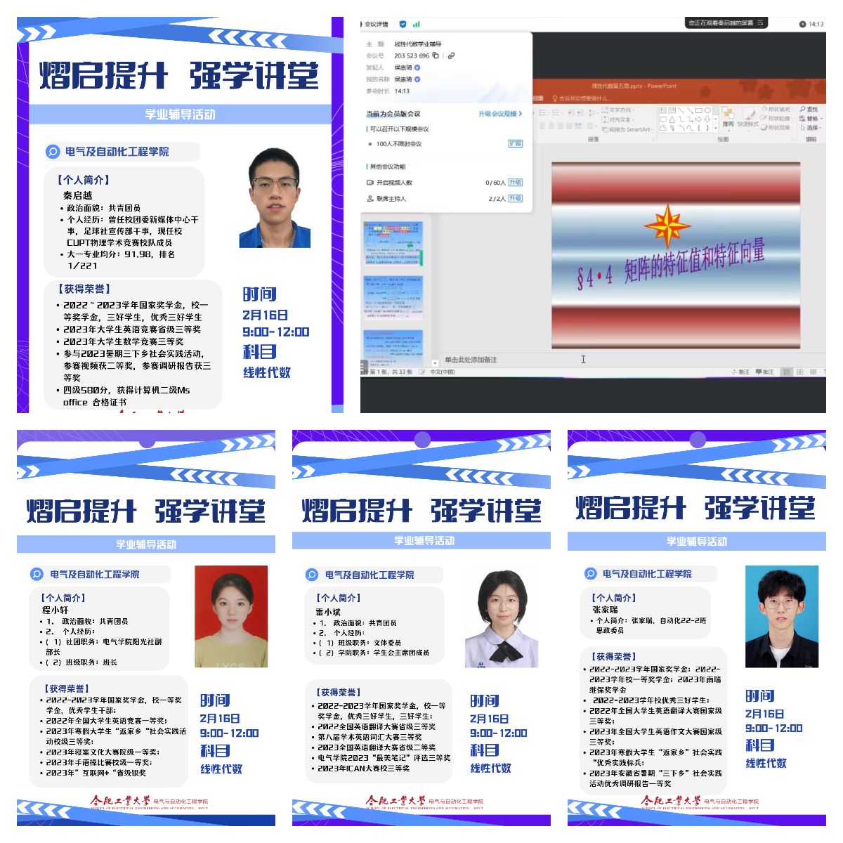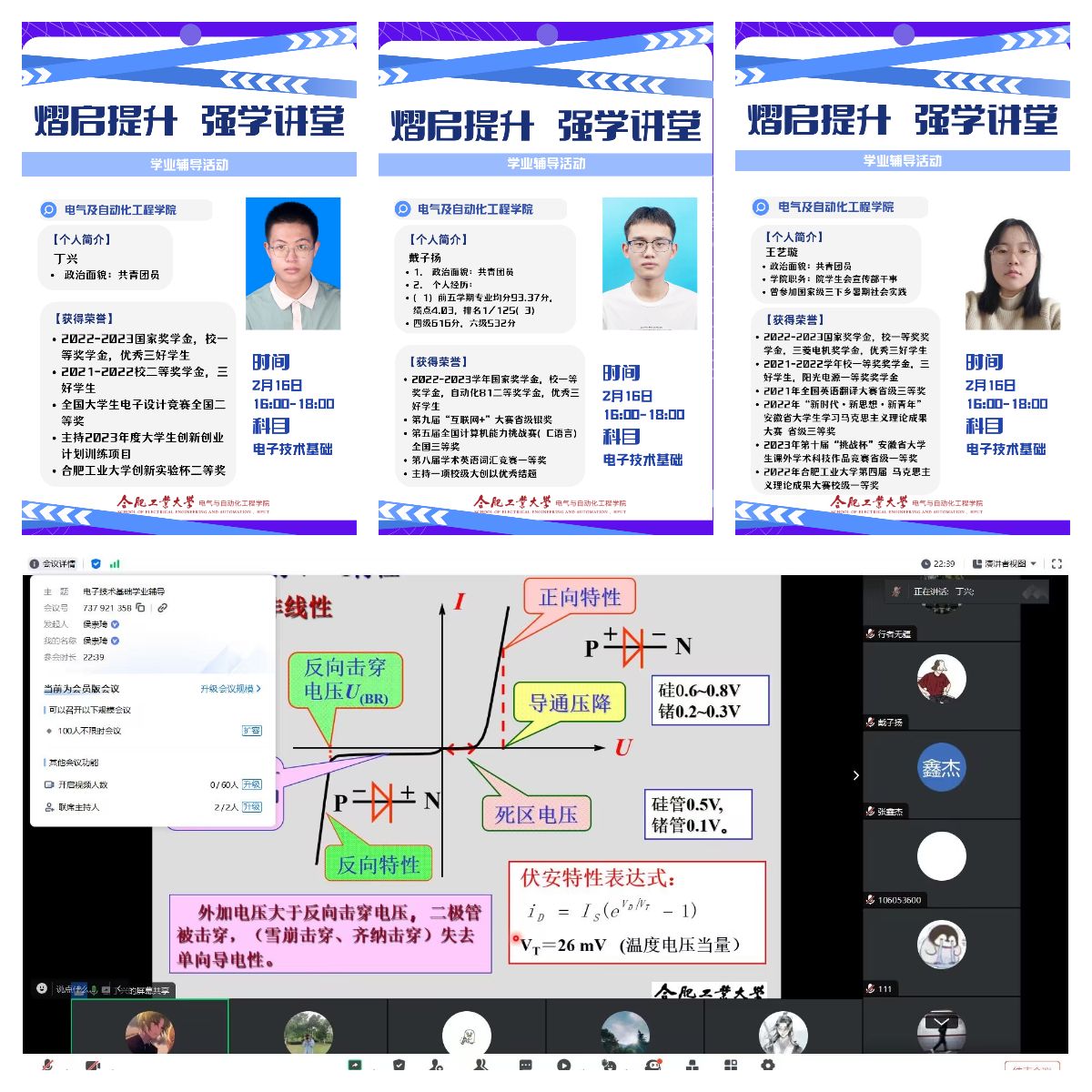 2月16日至2月18日,3003新葡的京集团网址开展“‘熠’启提升,强学讲堂”线上学业辅导活动,学院建立“骨干教师+朋辈讲师”学业导师队伍,各年级调研摸排学生需求,针对《电力电子技术》,《电子技术基础》,《线性代数》,《工程图学》等课程开展学业辅导,帮助学生掌握学习方法,把握重点难点,增添学习动能,树立学业信心,顺利通过考试,学院150余名学生参加活动。
